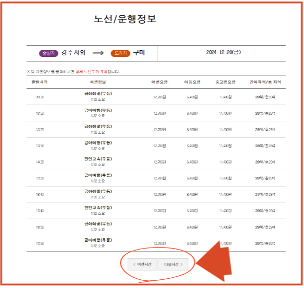 3. 배차 시간표가 조회됩니다. 시간, 요금, 잔여석등을 확인해서 예매계획을 세우세요