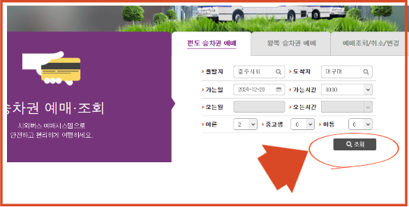 1. 시외버스통합예매사이트를 접속합니다. 메인화면에 승차권 예매, 조회에서 출발지에 경주시외, 도착지, 가는 일, 가는 시간을 입력하고 조회를 클릭해 줍니다.