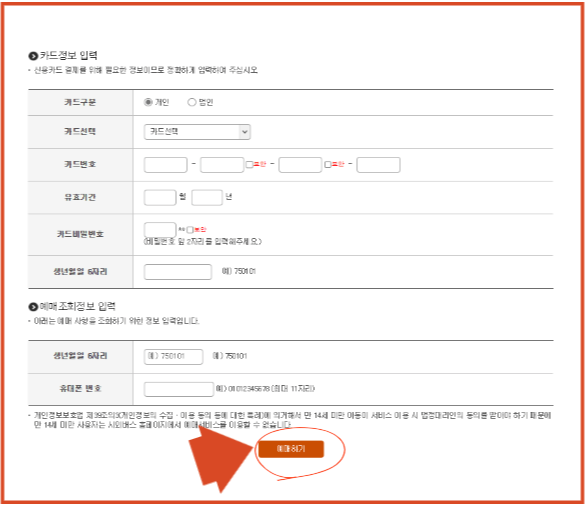 5. 카드정보를 입력하고 예매하기를 클릭하고 예매를 완료합니다