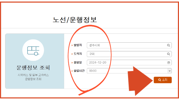 2. 출발지에 경주시외를 입력하고 도착지, 출발일, 출발시간을 지정하고 조회를 클릭해 줍니다 .