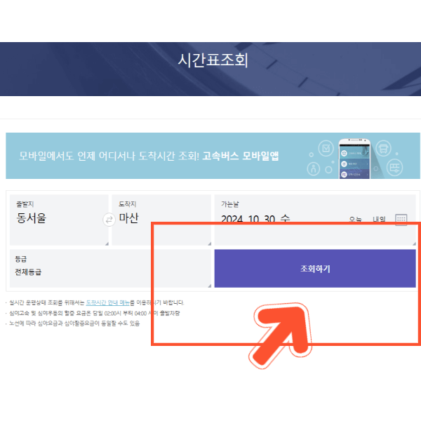 4. 가는날짜를 지정하고 버스 등급(전체등급을 주로 선택)을 선택하고 조회하기 버튼을 누르면 실시간으로 운행 시간표가 표시됩니다.