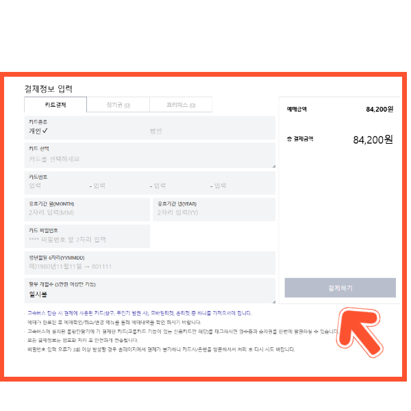 7. 예매정보를 하고 전체 약관에 동의 후 결제하기 버튼을 클릭하면 결제를 진행합니다.