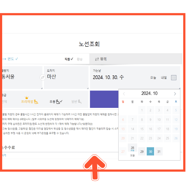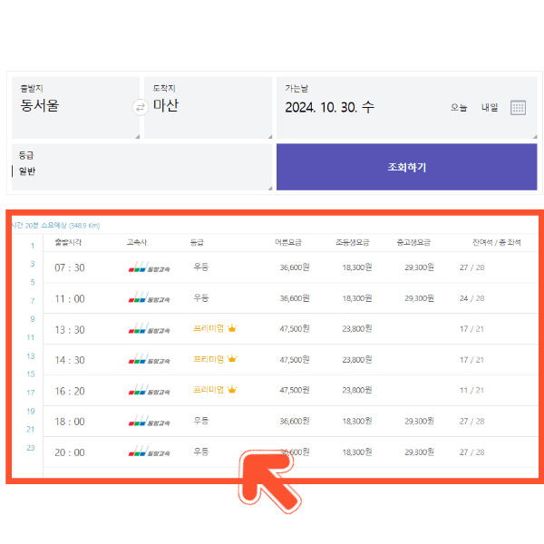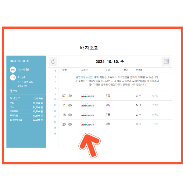 5. 소요시간, 출발시각, 요금,잔여석을 확인하고 이동계획에 맞춰 예매페이지로 넘어가면 됩니다.