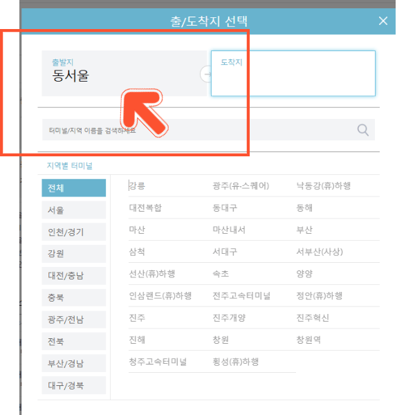 2. 출발지를 동서울을 선택합니다. 동서울에서 운행하는 여러 노선중 도착지를 선택합니다.