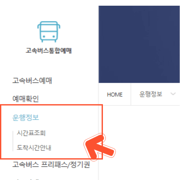 1. 코버스 (고속버스통합예매사이트)에 접속합니다. 왼쪽상단 시간표조회를 클릭합니다.