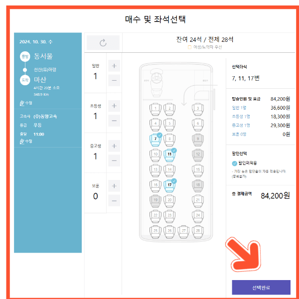 6. 탑승인원 한명 당 자석을 차례대로 선택, 요금 확인 후 선택완료 버튼를 클릭합니다.