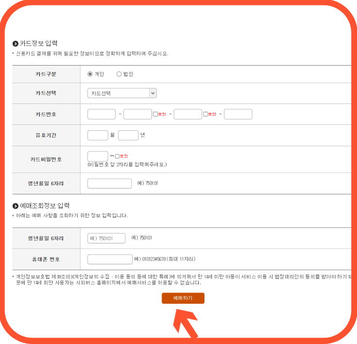 5. 결제을 위해 카드정보를 입력한 후 예매하기 버튼을 클릭하면 예매가 완료됩니다.