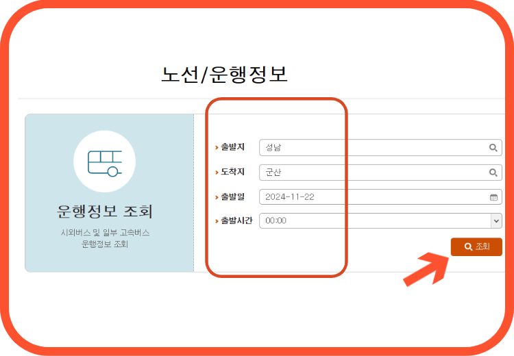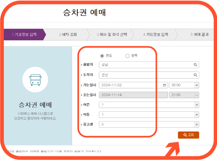2. 출발지에 성남시외버스터미널, 도착지, 가는일, 가는시간, 매수를 지정 후 조회버튼을 누릅니다.