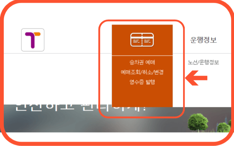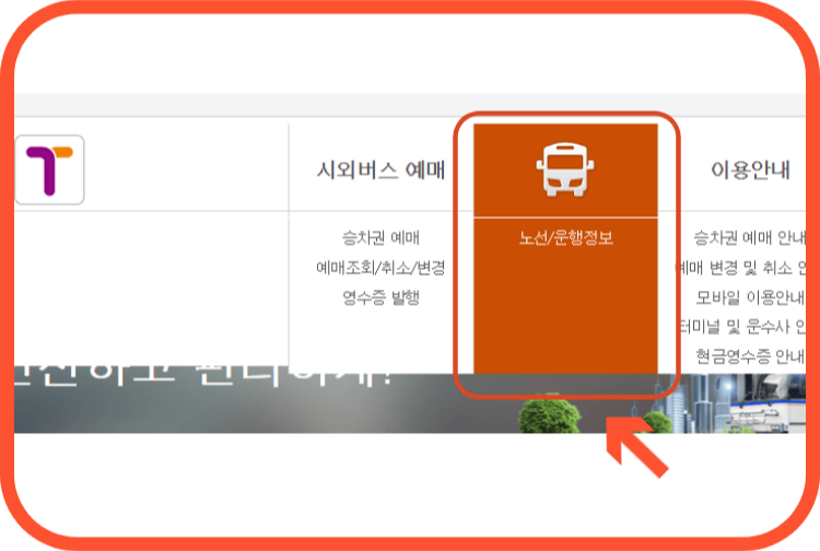 1. 시외버스통합예매시스템 홈페이지를 접속합니다. 상단 메뉴 노선/운행정보를 클릭합니다.