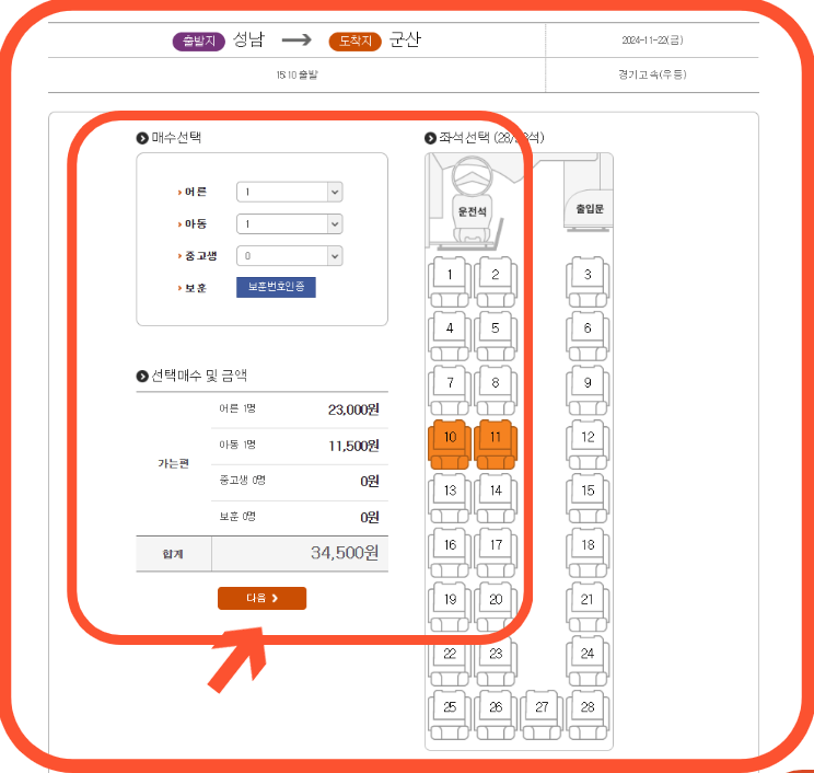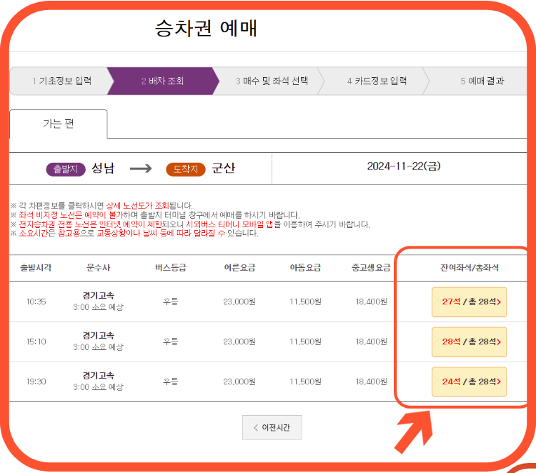 2. 배차조회로 보여진 시간표를 보고 잔여석이 남은 것을 확인 후 잔여석 버튼을 누릅니다.