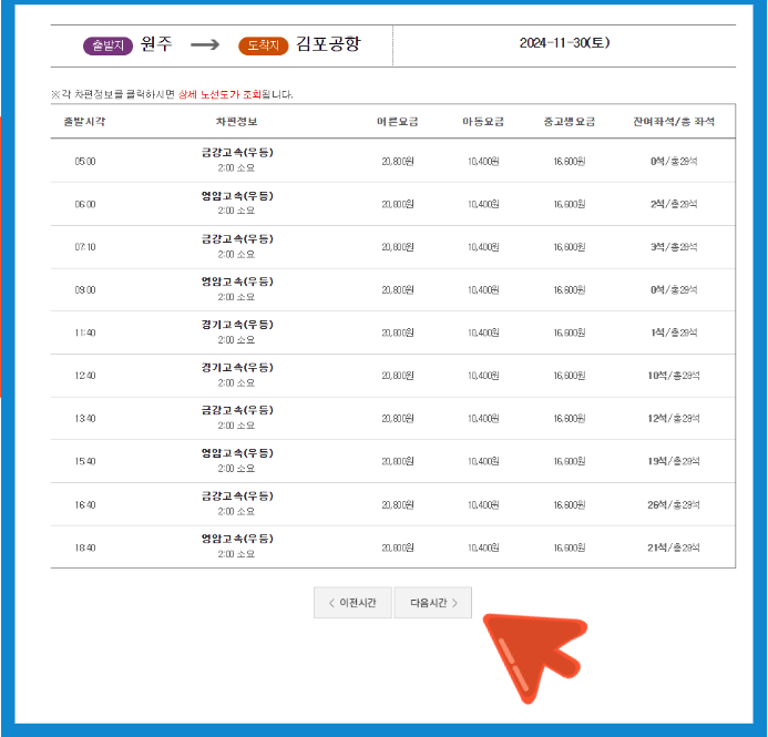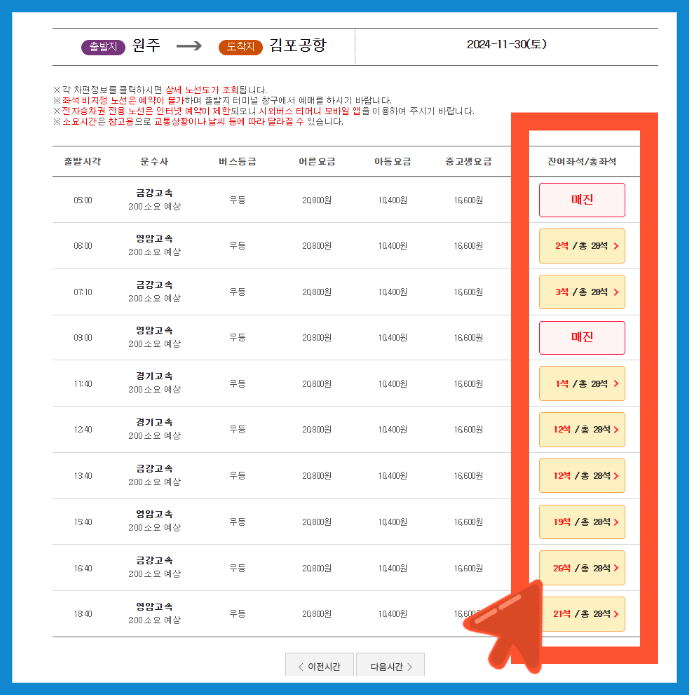 2. 배차조회가 나옵니다. 잔여석을 확인한 후 원하는 시간대 잔여석 좌석을 클릭해 줍니다. 잔여석이 없으면 매진으로 표시되고 예매가 불가합니다)
