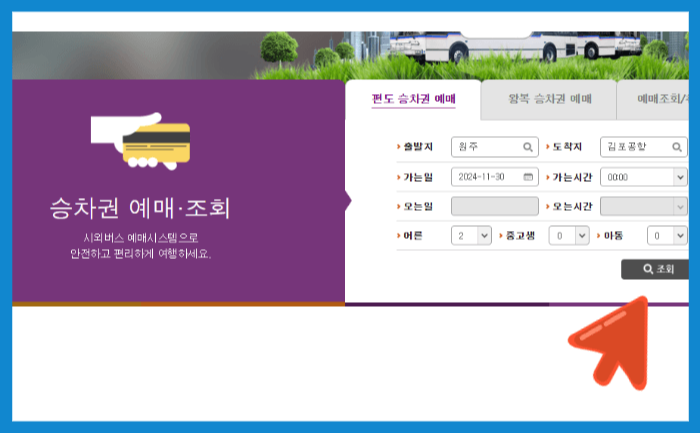 1. 시외버스통합예매사이트에 들어가면 메인화면에 승차권 예매,조회가 보입니다. 바로 출발지에 원주, 도착지, 가는일, 가는시간을 지정한 후 조회 버튼을 클릭해 줍니다.