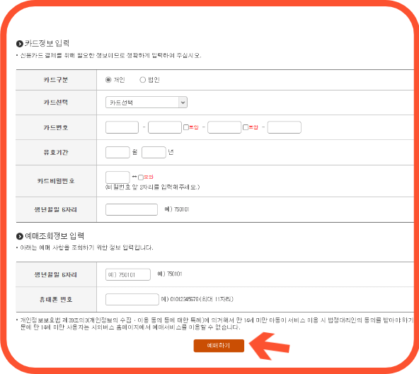 6. 카드정보입력란에 정확하게 입력해 준 후 예매하기 버튼을 누르면 결제가 완료됩니다.