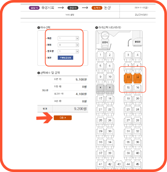 4. 매수선택, 좌석선택을 지정하고 총 금액을 확인하세요 그리고 다음 버튼을 눌러 클릭합니다.