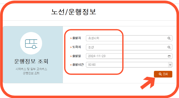 2. 출발지에 유성을 지정하고 가시고자 하는 도착지와 출발일, 출발시간을 지정한 후 조회버튼을 클릭합니다.