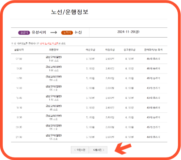 유성성시외버스터미널 현장에서 예매를 하실 수 있습니다. 시간표를 확인 한 후 예매를 진행합니다.