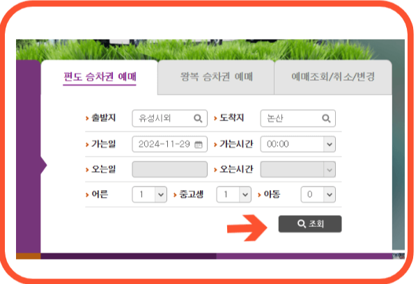 2. 편도승차권, 왕복승차권을 선택한 후 출발지에 유성을 지정하고 도착지, 가는일, 가는시간, 어른,중고생,아동 매수를 지정 후 조회버튼으 클릭해 줍니다.