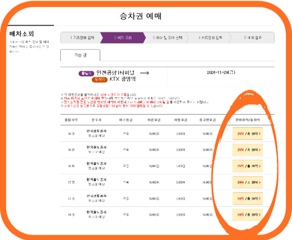 2. 배차조회가 나오면 원하는 시간을 정하고 잔여석이 있는 버튼을 클릭합니다.